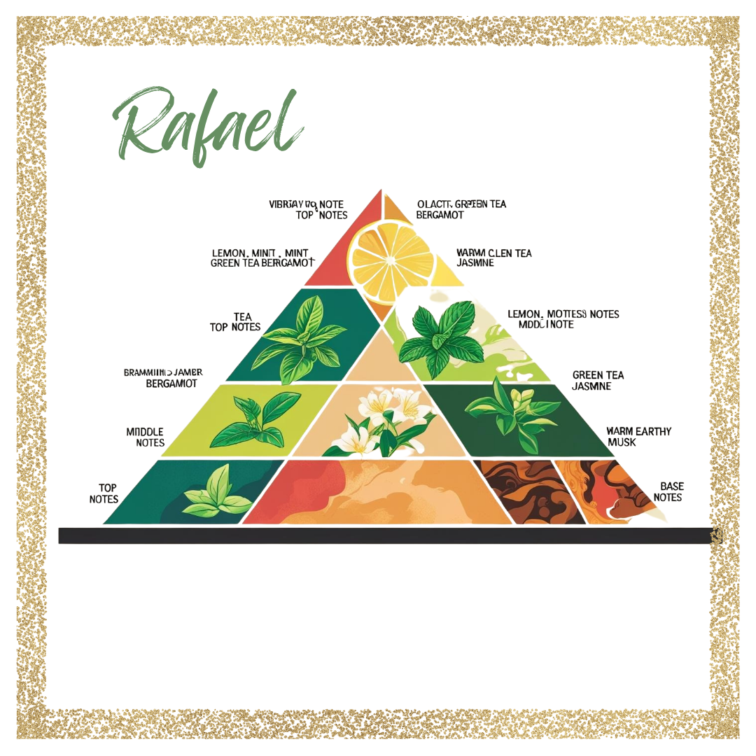 Una fragancia que revitaliza el cuerpo y el espíritu: el limón, la bergamota y la naranja despiertan la energía vital, trayendo luz, claridad y frescura a cada instante, mientras la menta refresca y purifica, recordándonos la renovación constante. El corazón se despliega con jazmín, que aporta armonía, paz y apertura del alma, evocando la compasión y la guía sanadora de Rafael.
